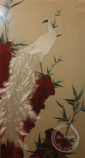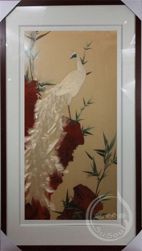 以4丝2丝制作苏绣孔雀,色彩温润华美,气韵高贵不凡。丝线刻画孔雀流泻的尾羽,丝丝入扣,精美无比。寓意无限风光在险峰。此苏绣精品孔雀图,可以用作高档商务礼品,高级生日礼物。