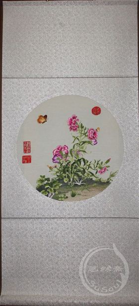 春天,虞美人婀娜盛开,蝴蝶翩翩而来。以8丝制作苏绣花鸟卷轴,色彩温雅恬润,富丽堂皇。虞美人柔美舒展,滋润妩媚,富贵天成。此刺绣画卷是郎世宁画作刺绣,是具有中国特色的礼品。卷轴便于携带,适宜用作出国礼品。